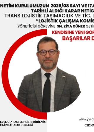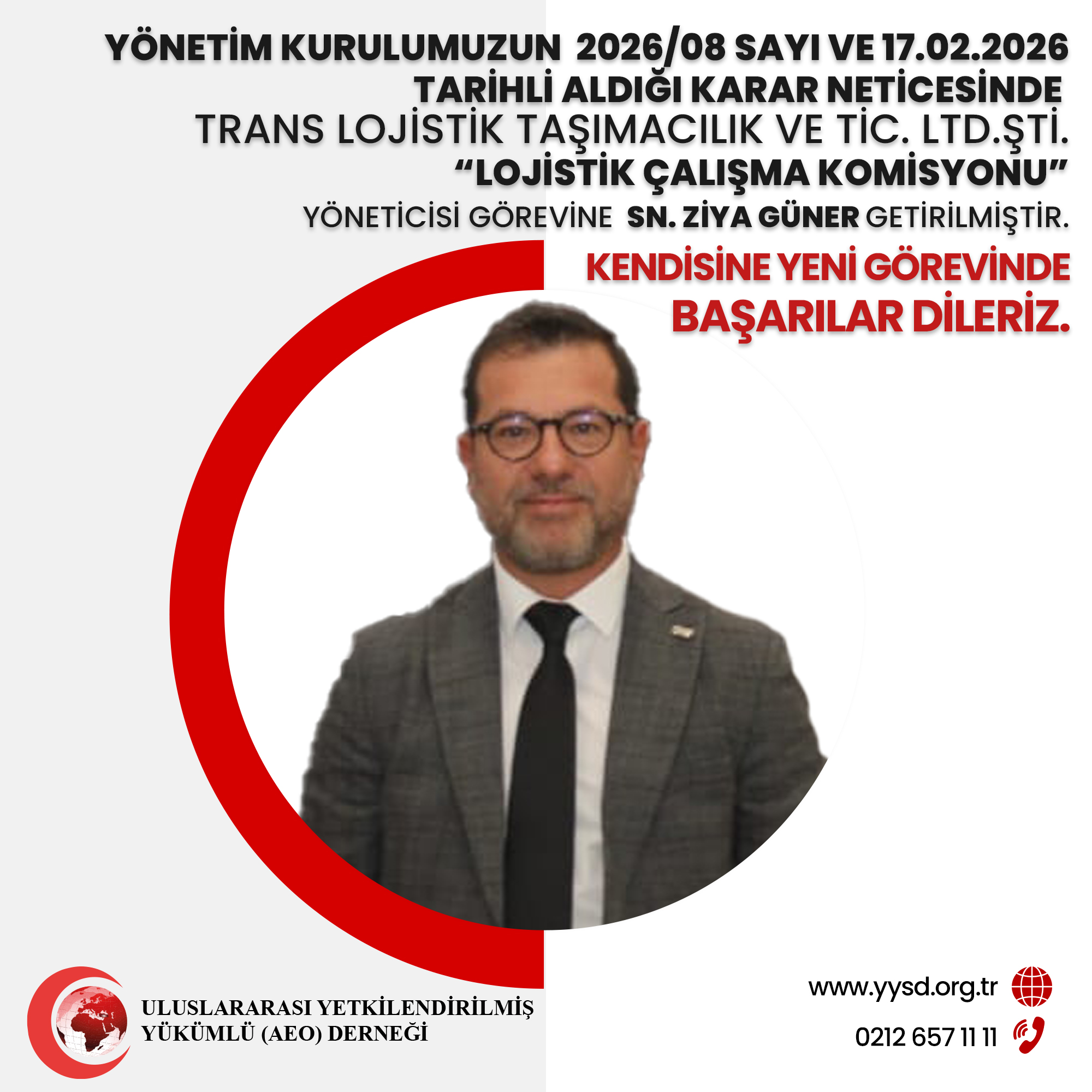 Yönetim Kurulumuzun 2026/08 sayı ve 17.02.2026 tarihli aldığı karar neticesinde Trans Lojistik Taşımacılık Ve Tic. Ltd.Şti. firmasını temsilen “Lojistik Çalışma Komisyonu” yöneticisi görevine Sn. Ziya GÜNER getirilmiştir.