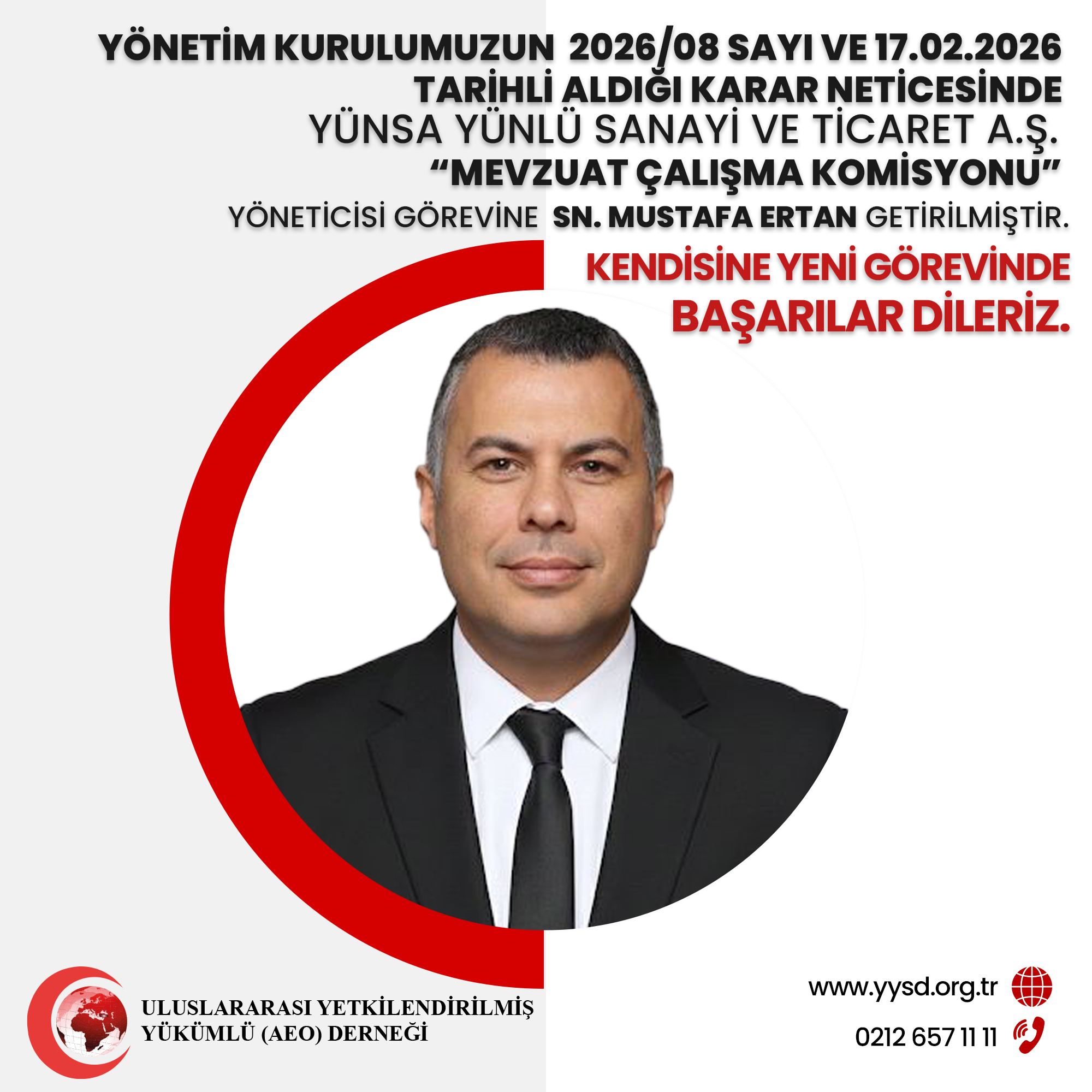 Yönetim Kurulumuzun 2026/08 sayı ve 17.02.2026 tarihli aldığı karar neticesinde Yünsa Yünlü Sanayi Ve Ticaret A.Ş. firmasını temsilen “Mevzuat Çalışma Komisyonu” yöneticisi görevine Sn. Mustafa ERTAN getirilmiştir.