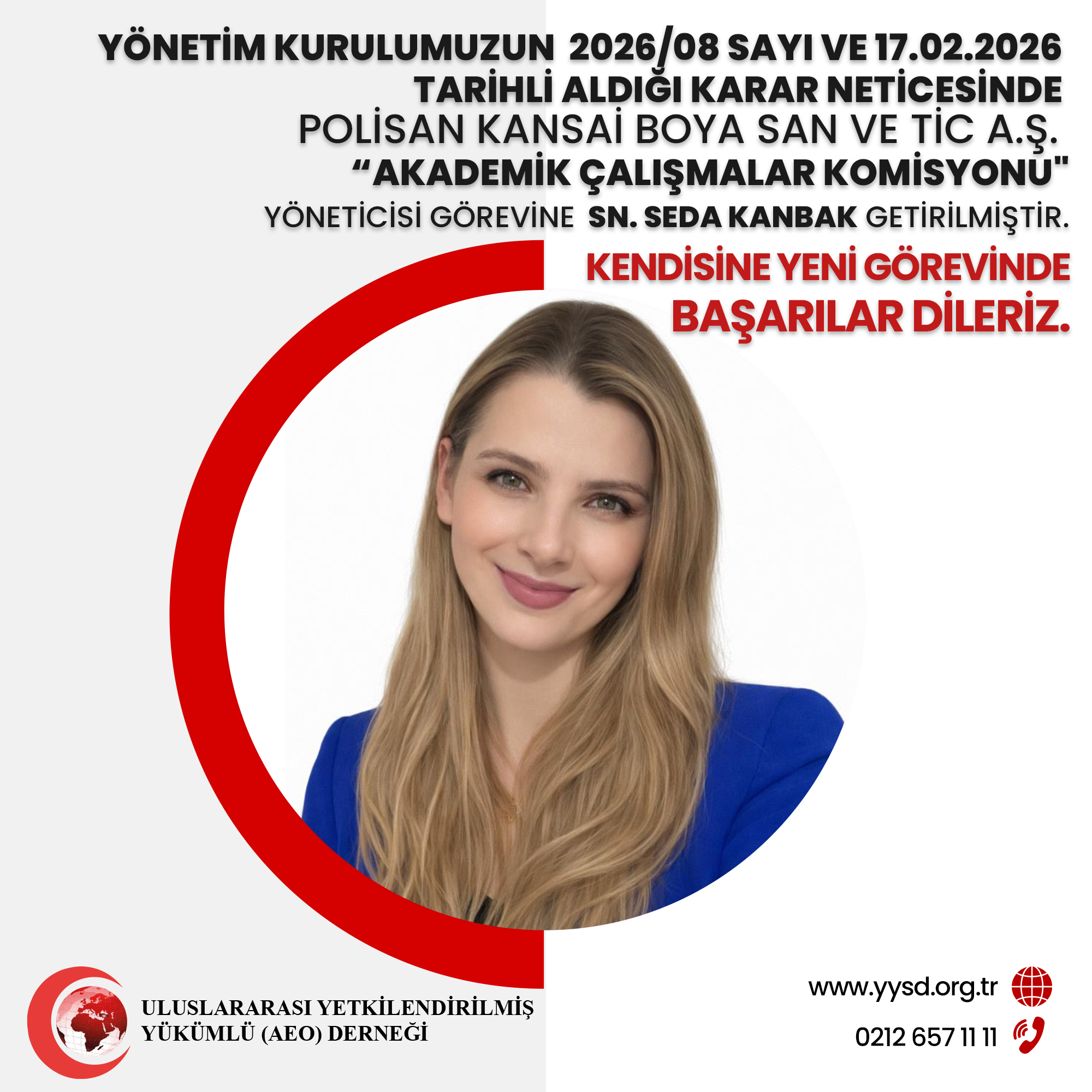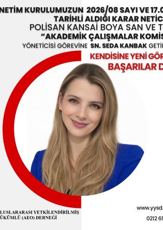 As a result of the decision taken by our Board of Directors on 17.02.2026, numbered 2026/08, Ms. Seda KANBAK has been appointed as the manager of the “Academic Studies Commission” on behalf of Polisan Kansai Boya San Ve Tic A.Ş. We wish her success in her new role.